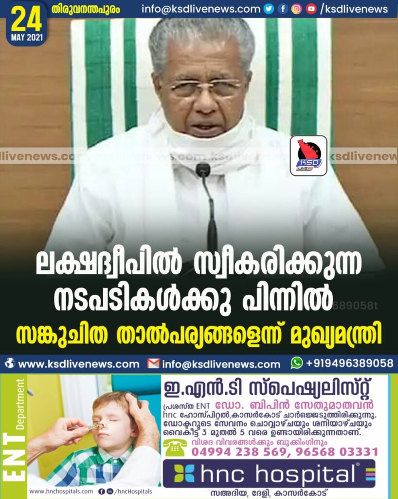 ലക്ഷദ്വീപില് സ്വീകരിക്കുന്ന നടപടികള്ക്കു പിന്നില് സങ്കുചിത താല്പര്യങ്ങളെന്ന് മുഖ്യമന്ത്രി