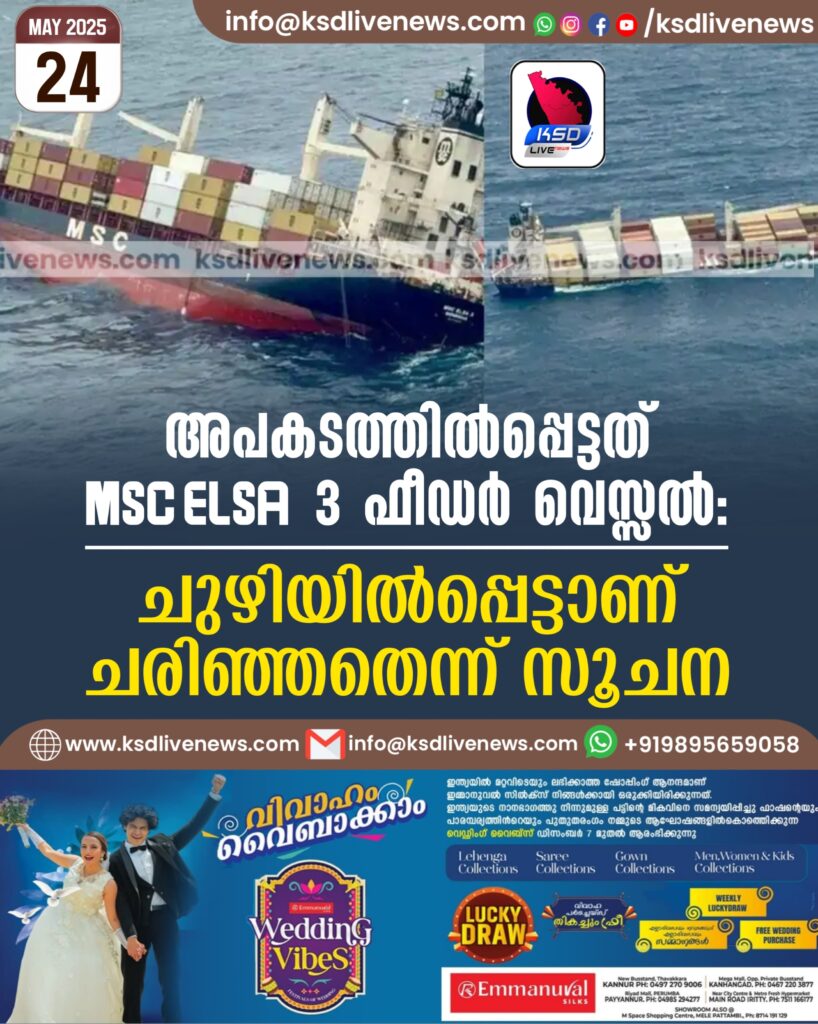 അപകടത്തില്‍പ്പെട്ടത് MSC ELSA 3 ഫീഡര്‍ വെസ്സല്‍, ചുഴിയില്‍പ്പെട്ടാണ് ചരിഞ്ഞതെന്ന് സൂചന