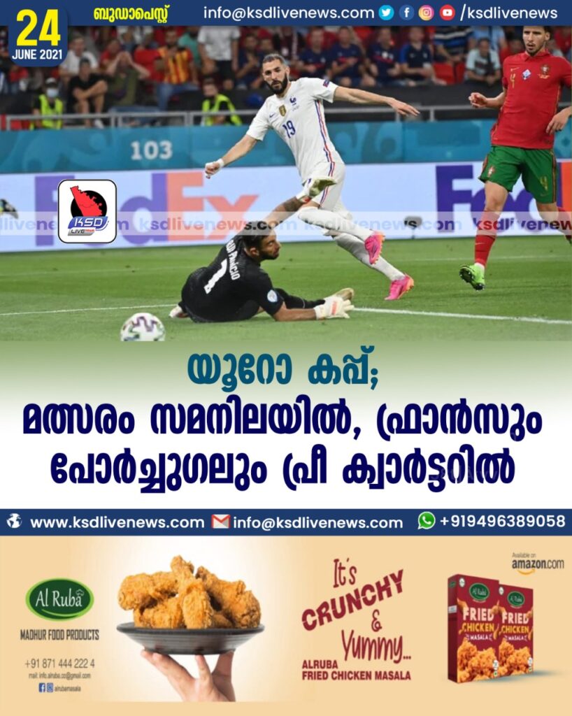 ബുഡാപെസ്റ്റ്: നിർണായകമായ മത്സരത്തിൽ കരുത്തരായ പോർച്ചുഗലിനെ സമനിലയിൽ കുരുക്കി ഫ്രാൻസ് യൂറോ കപ്പിന്റെ പ്രീ ക്വാർട്ടറിൽ പ്രവേശിച്ചു. ഇരുടീമുകളും രണ്ട് ഗോളുകൾ വീതം നേടി. ഗ്രൂപ്പ് എഫിൽ നിന്നും ഗ്രൂപ്പ് ചാമ്പ്യന്മാരായാണ് ഫ്രാൻസിന്റെ പ്രീക്വാർട്ടർ പ്രവേശനം. തോറ്റെങ്കിലും ഗ്രൂപ്പിൽ നിന്നും മൂന്നാം സ്ഥാനക്കാരായി പോർച്ചുഗലും പ്രീക്വാർട്ടറിൽ പ്രവേശിച്ചു.