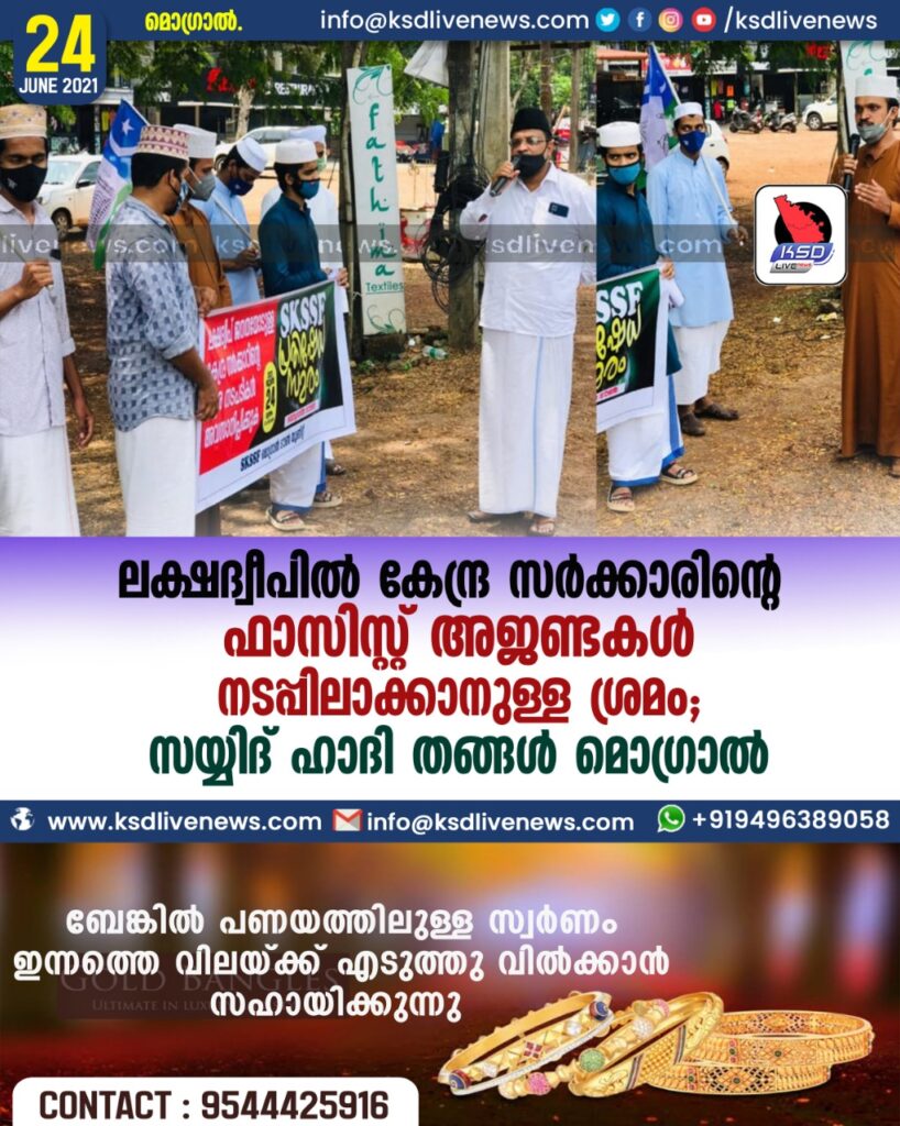 ലക്ഷദ്വീപിൽ കേന്ദ്ര സർക്കാരിന്റെ ഫാസിസ്റ്റ് അജണ്ടകൾ നടപ്പിലാക്കാനുള്ള ശ്രമം;സയ്യിദ് ഹാദി തങ്ങൾ മൊഗ്രാൽ.