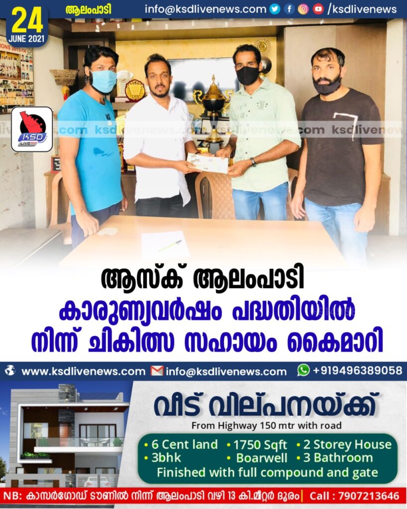 ആലംപാടി ബാഫഖി നഗറിലെ കൂലിപ്പണി എടുത്തു കുടുംബം പോറ്റിയിരുന്ന ഒരു സഹോദരൻ പെട്ടന്നുണ്ടായ ശാരീരിക അസ്വസ്ഥകൾ കാരണം ചെങ്കള ഇ.കെ നായനാർ ഹോസ്പിറ്റലിൽ കാണിക്കുകയും സ്ഥിതി ഗുരുതരമായതിനാൽ 3 ദിവസം ICU-വിൽ പ്രവേശിപ്പിക്കുകയും ചെയ്തിട്ടുണ്ട്. അടിയന്തിര ആവശ്യത്തിലേക്കായി ആസ്‌ക് ജി സി സി കാരുണ്യവർഷം ചികിത്സാ പദ്ധതി യിൽ നിന്നും പതിനായിരംരൂപ ആസ്ക് ജിസിസി അംഗം അസീസ് കാസി ആസ്ക് പ്രവർത്തകസമിതി അംഗം അഷ്റഫ് ടി എം എക് കൈമാറി. മുനീർ, ഹമീദ് എം എന്നിവർ സംബന്ധിച്ചു.