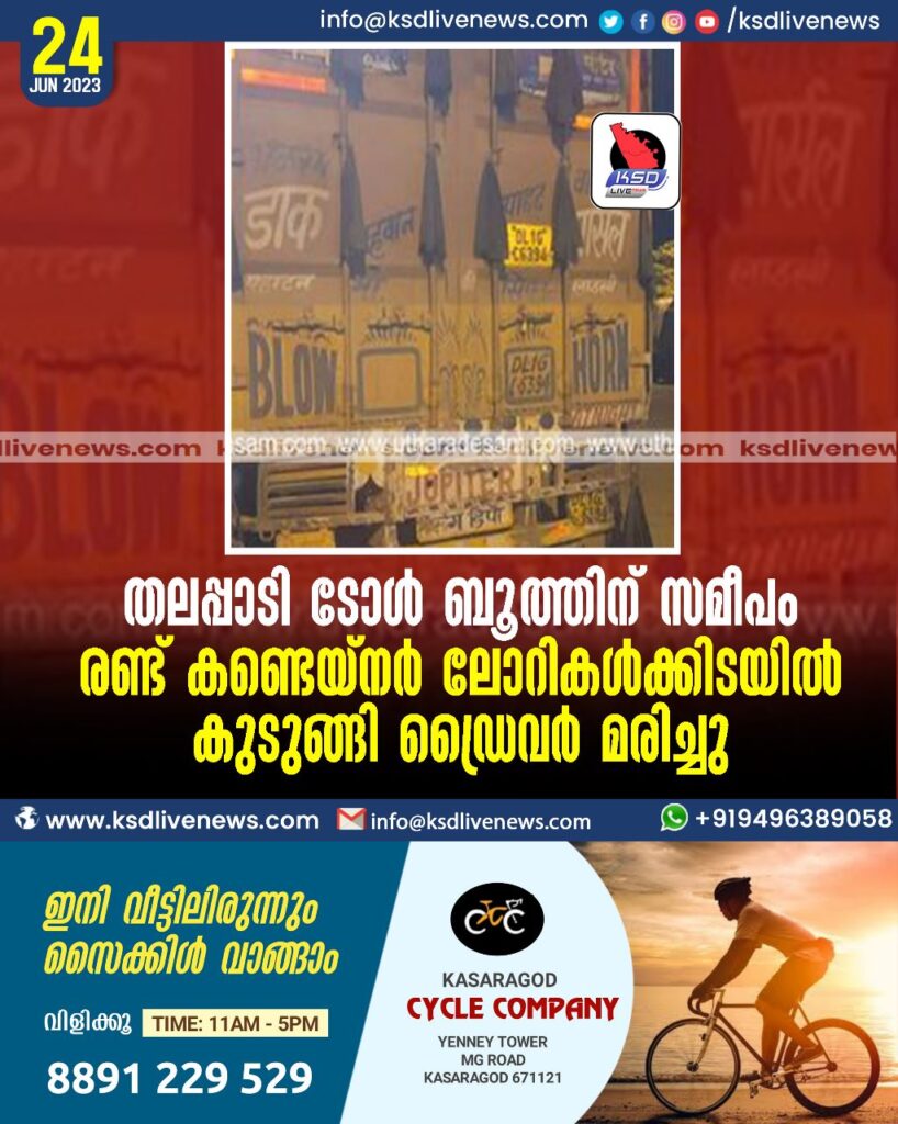 തലപ്പാടി ടോള്‍ ബൂത്തിന് സമീപം രണ്ട് കണ്ടെയ്‌നര്‍ ലോറികള്‍ക്കിടയില്‍ കുടുങ്ങി ഡ്രൈവര്‍ മരിച്ചു