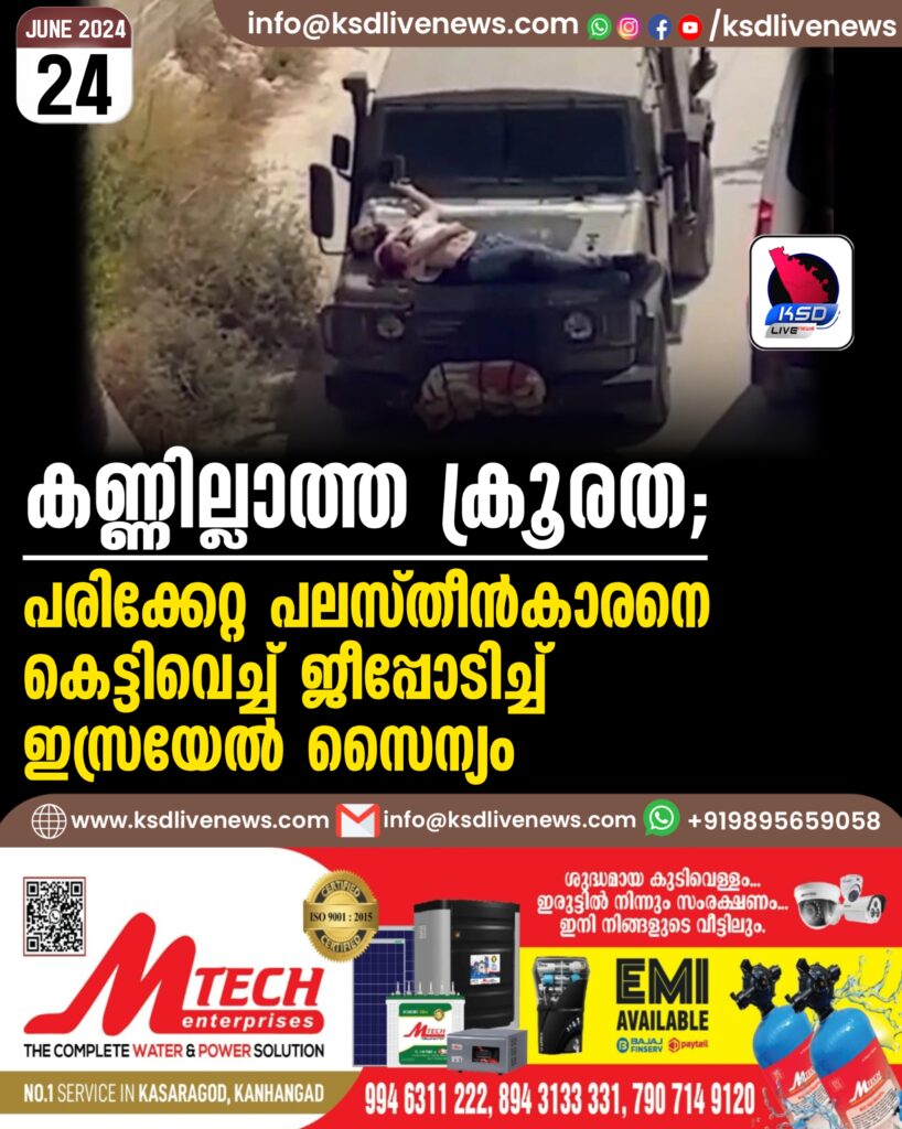 കണ്ണില്ലാത്ത ക്രൂരത; പരിക്കേറ്റ പലസ്തീൻകാരനെ കെട്ടിവെച്ച് ജീപ്പോടിച്ച് ഇസ്രയേൽ സൈന്യം
