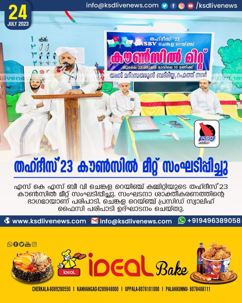 ചെങ്കള: എസ് കെ എസ് ബീ വി ചെങ്കള റെയിഞ്ച് കമ്മിറ്റിയുടെ തഹ്ദീസ്’23 കൗൺസിൽ മീറ്റ് സംഘടിപ്പിച്ചു. സംഘടനാ ശാക്തീകരണത്തിന്റെ ഭാഗമായാണ് പരിപാടി. ചെങ്കള റെയ്ഞ്ച് പ്രസിഡണ്ട് സ്വാലിഹ് ഫൈസി പരിപാടി ഉദ്ഘാടനം ചെയ്തു. ചെങ്കള റെയിഞ്ച് സെക്രട്ടറി മുഹമ്മദലി നദ്വി പ്രാർത്ഥന നടത്തി.എസ് കെ എസ് ബീ വി ചെങ്കള റെയ്ഞ്ച് കൺവീനർ മുഹമ്മദ് ഹാഫിള് ദാരിമി സ്വാഗത പറഞ്ഞു. ചെയർമാൻ ഇഖ്ബാൽ ഹുദവി അദ്ധ്യക്ഷതവഹിച്ചു. പുതിയ തലമുറയിലുള്ള കുട്ടികൾ എങ്ങനെ വളരണം എന്നതിനെപ്പറ്റി അബ്ദുല്ലത്തീഫ് മൗലവി പ്രസംഗിച്ചു. 2023,24 ചെങ്കള റെയ്ഞ്ച് പ്രസിഡന്റായി ഹാദി ഹുസൈൻ ചെങ്കളയേയും ജനറൽ സെക്രട്ടറിയായി അനസ് മാരയെയും ട്രഷററായി സിദീഖുൽ അക്ബറിനെയും തെരഞ്ഞെടുത്തു. കബീർ ദാരിമി, അഫ്സൽ അസ്നവി, ലത്തീഫ് യമാനി,ഷാഫി ഫൈസി തുടങ്ങിയവർ സംബന്ധിച്ചു.