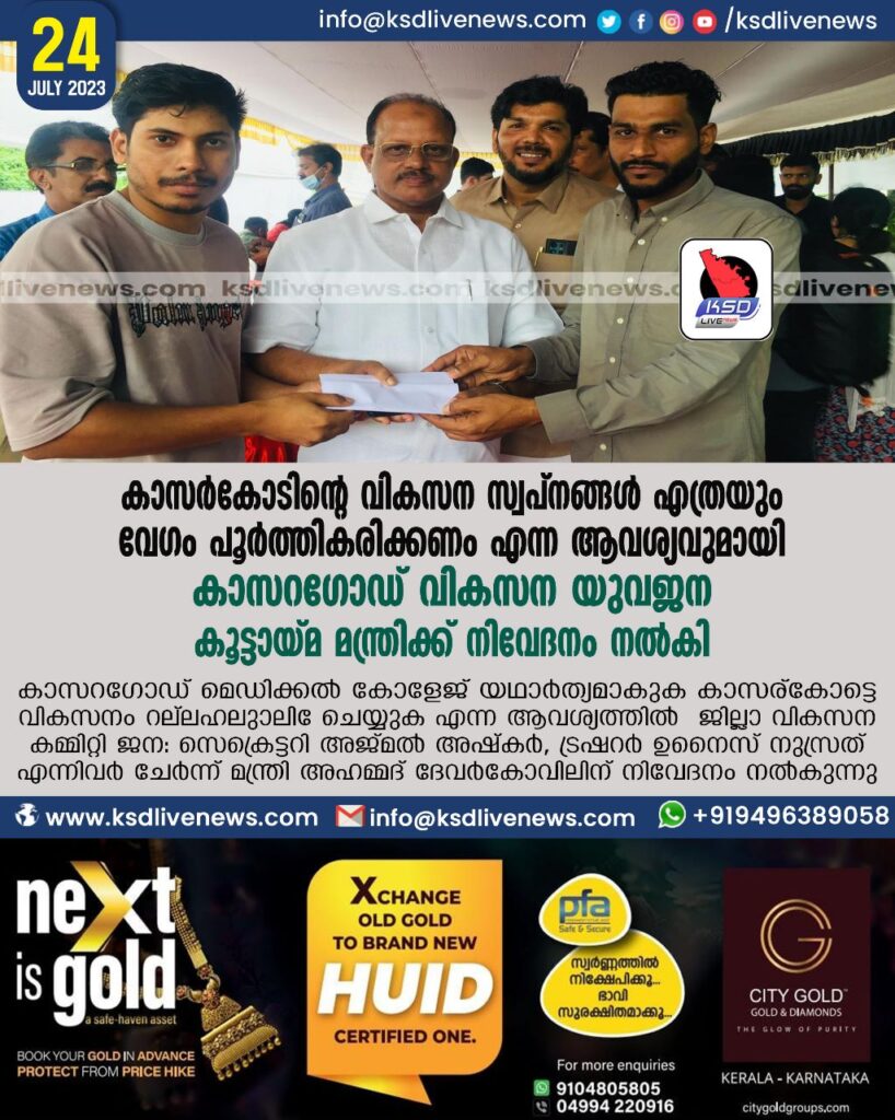 കാസർകോടിൻ്റെ വികസന സ്വപ്നങ്ങൾ എത്രയും വേഗം പൂർത്തികരിക്കണം എന്ന ആവശ്യവുമായി കാസറഗോഡ് വികസന യുവജന കൂട്ടായ്മ മന്ത്രിക്ക് നിവേദനം നൽകി