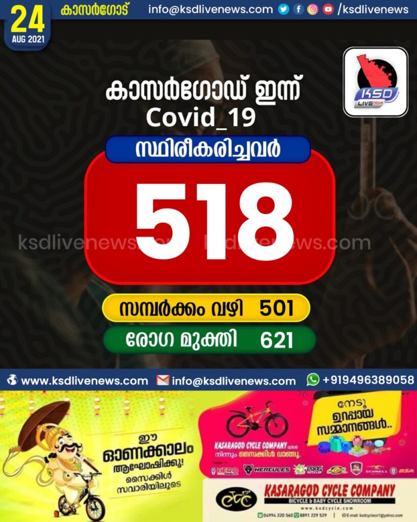 കാസർഗോഡ് ജില്ലയിൽ ഇന്ന് 518 പേർക്ക് കോവിഡ് സ്ഥിരീകരിച്ചു. സമ്പർക്കം വഴി 501 പേർക്കും. 621 പേർക്ക് രോഗമുക്തി