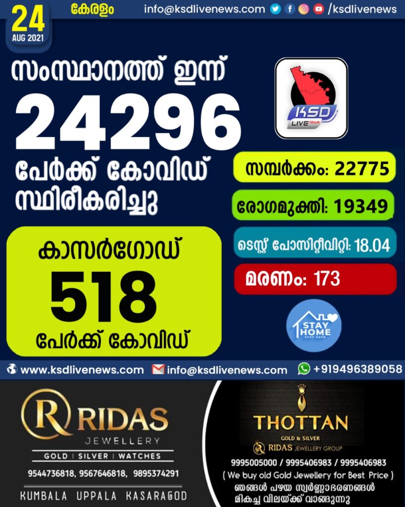 കോവിഡിൽ വിറച്ച് കേരളം; സംസ്ഥാനത്ത് ഇന്ന് 24,296 പേർക്ക് കോവിഡ് സ്ഥിരീകരിച്ചു. സമ്പർക്കം വഴി 22,775 പേർക്കും ; 19,349 പേർക്ക് രോഗ മുക്തിയും ; കാസർഗോഡ് ജില്ലയിൽ 518 പേർക്ക് കോവിഡ് ; മരണം 173
