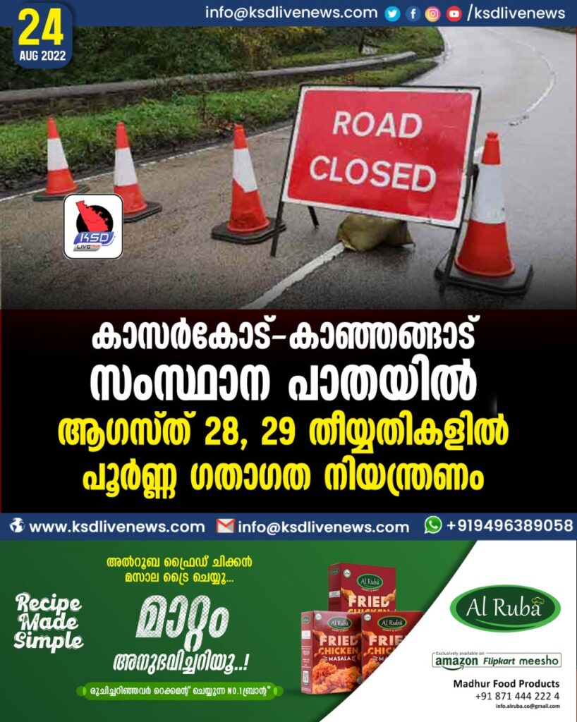 കാസര്കോട്-കാഞ്ഞങ്ങാട് സംസ്ഥാന പാതയില് ആഗസ്ത് 28, 29 തീയ്യതികളില് പൂര്ണ്ണ ഗതാഗത നിയന്ത്രണം