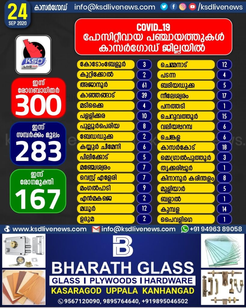 കാസർഗോഡ് ജില്ലയിൽ ഇന്ന് കോവിഡ് പോസിറ്റീവായവരുടെ പഞ്ചായത്ത് തിരിച്ചുള്ള സ്ഥിതി വിവര കണക്ക്