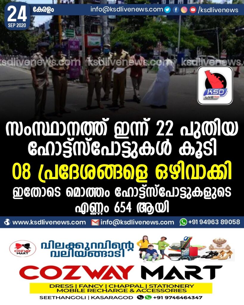 ഇന്ന് 22 പുതിയ ഹോട്ട് സ്‌പോട്ടുകളാണുള്ളത്. ആലപ്പുഴ ജില്ലയിലെ കണ്ടല്ലൂര്‍ (കണ്ടൈന്‍മെന്റ് സോണ്‍ സബ് വാര്‍ഡ് 11), പനവള്ളി (6), പുലിയൂര്‍ (സബ് വാര്‍ഡ് 4), മാവേലിക്കര മുന്‍സിപ്പാലിറ്റി (സബ് വാര്‍ഡ് 9), പാലക്കാട് ജില്ലയിലെ കിഴക്കാഞ്ചേരി (21), നെല്ലായ (11), നെന്മാറ (15), തൃക്കടീരി (14), തൃശൂര്‍ ജില്ലയിലെ വെള്ളാങ്കല്ലൂര്‍ (സബ് വാര്‍ഡ് 2), ചാലക്കുടി (സബ് വാര്‍ഡ് 32), മുളങ്കുന്നത്തുകാവ് (സബ് വാര്‍ഡ് 3), പത്തനംതിട്ട ജില്ലയിലെ കടമ്പനാട് (9), മല്ലപ്പുഴശേരി (സബ് വാര്‍ഡ് 4), പ്രമാടം (8) കോട്ടയം ജില്ലയിലെ കൂരൂപ്പട (3), രാമപുരം (5, 13), മലപ്പുറം മഞ്ചേരി മുന്‍സിപ്പാലിറ്റി (2, 48, 49), താനൂര്‍ മുന്‍സിപ്പാലിറ്റി (1, 2, 3, 4, 5, 6, 7, 8, 9, 10, 11, 12, 13, 14, 15, 16, 17, 21, 22, 23, 24, 25, 26, 27, 28, 29, 30, 31, 32, 33, 34, 35, 36, 37, 38, 39, 40, 41, 42, 43, 44), ഇടുക്കി ജില്ലയിലെ ഇരട്ടയാര്‍ (സബ് വാര്‍ഡ് 7, 8), കോഴിക്കോട് ജില്ലയിലെ പേരാമ്പ്ര (സബ് വാര്‍ഡ് 5, 15), തിരുവനന്തപുരം ജില്ലയിലെ കിഴുവില്ലം (3, 4), കൊല്ലം ജില്ലയിലെ പോരുവഴി (സബ് വാര്‍ഡ് 15) എന്നിവയാണ് പുതിയ ഹോട്ട് സ്‌പോട്ടുകള്‍.