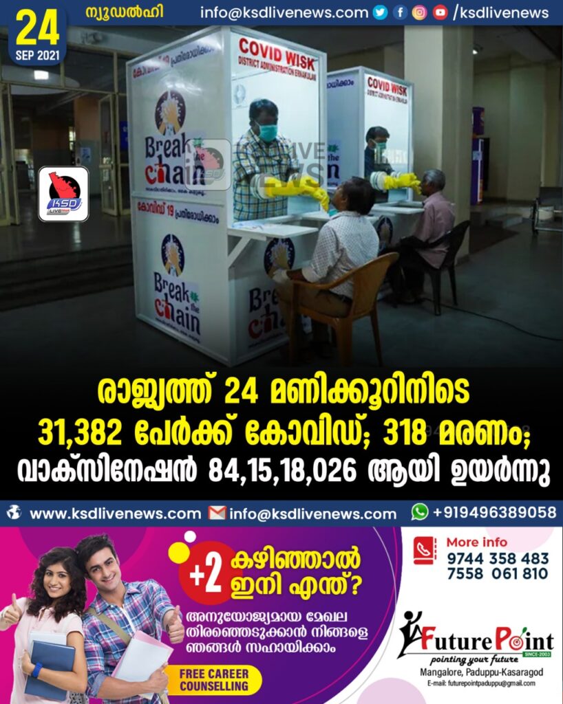 രാജ്യത്ത് 24 മണിക്കൂറിനിടെ 31,382 പേർക്ക് കോവിഡ്; 318 മരണം; വാക്സിനേഷൻ 84,15,18,026 ആയി ഉയർന്നു