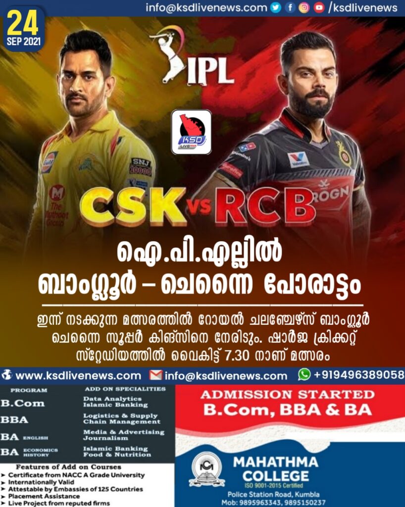 ഷാർജ: ഇന്ത്യൻ പ്രീമിയർ ലീഗിലെ ഏറ്റവും വാശിയേറിയ പോരാട്ടത്തിന് അരങ്ങുണരുന്നു. ഇന്ന് നടക്കുന്ന മത്സരത്തിൽ ബാംഗ്ലൂർ റോയൽ ചലഞ്ചേഴ്സ് ചെന്നൈ സൂപ്പർ കിങ്സിനെ നേരിടും. ഷാർജ ക്രിക്കറ്റ് സ്റ്റേഡിയത്തിൽ വൈകിട്ട് 7.30 നാണ് മത്സരം.