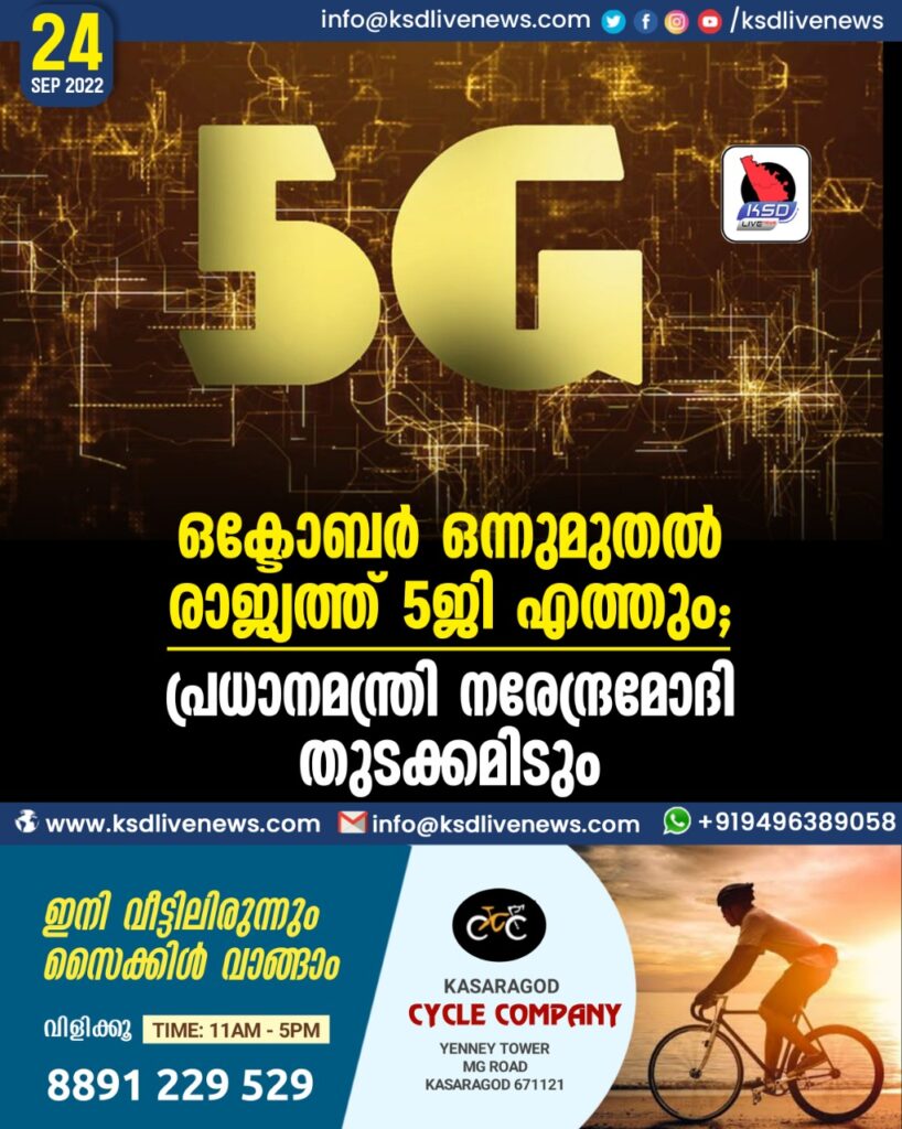 ഒക്ടോബര് ഒന്നുമുതല് രാജ്യത്ത് 5ജി എത്തും; പ്രധാനമന്ത്രി നരേന്ദ്രമോദി തുടക്കമിടും