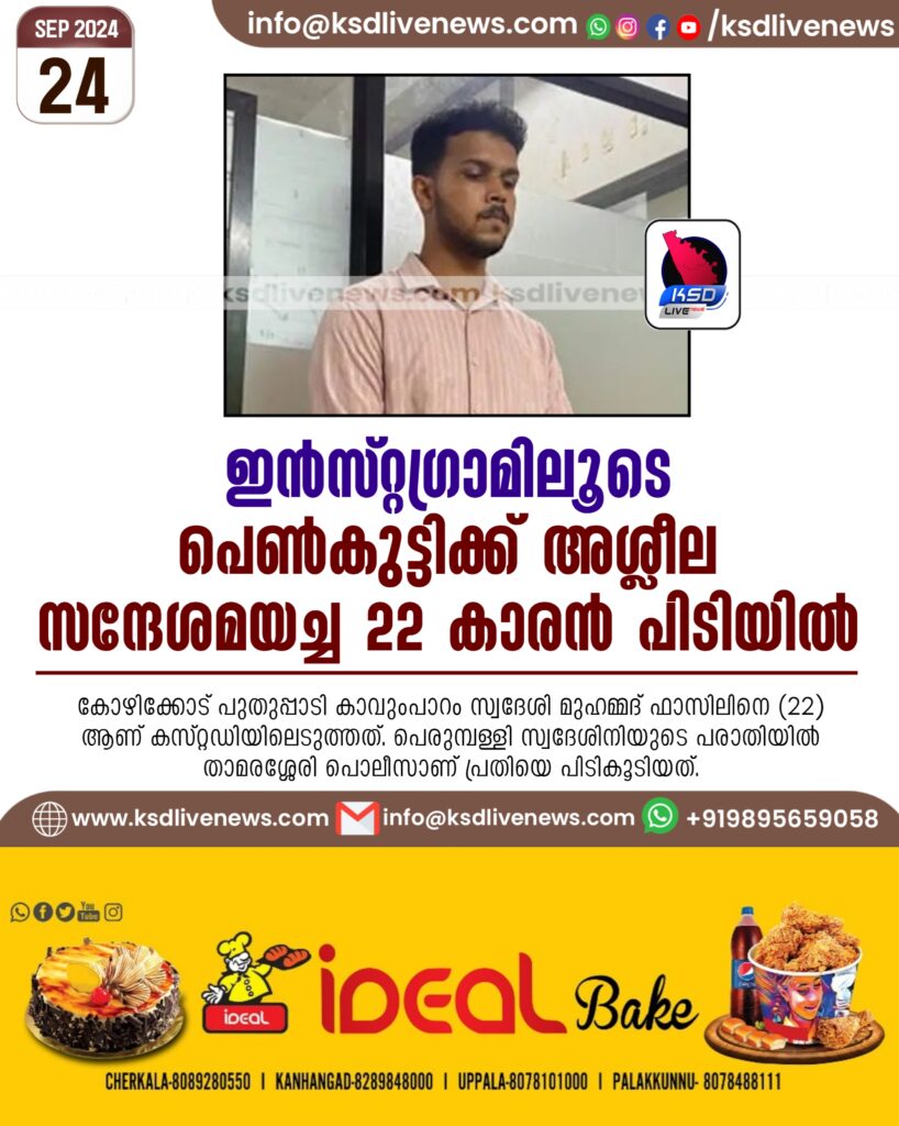 കോഴിക്കോട്: പെൺകുട്ടിക്ക് ഇൻസ്റ്റഗ്രാമിലൂടെ അശ്ലീല സന്ദേശമയച്ച യുവാവ് അറസ്റ്റിൽ. കോഴിക്കോട് പുതുപ്പാടി കാവുംപാറം സ്വദേശി മുഹമ്മദ് ഫാസിലിനെ (22) ആണ് കസ്റ്റഡിയിലെടുത്തത്. പെരുമ്പള്ളി സ്വദേശിനിയുടെ പരാതിയിൽ താമരശ്ശേരി പൊലീസാണ് പ്രതിയെ പിടികൂടിയത്.
