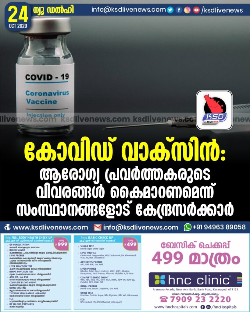 അടുത്ത വെള്ളിയാഴ്ചയ്ക്കകം മുഴുവന്‍ ആരോഗ്യ പ്രവര്‍ത്തകരുടെയും വിവരങ്ങള്‍ കൈമാറണമെന്നാണ് കേന്ദ്ര സര്‍ക്കാര്‍ വിവിധ സംസ്ഥാനങ്ങളോട് നിര്‍ദ്ദേശിച്ചിട്ടുള്ളത്. സെറം ഇന്‍സ്റ്റിറ്റ്യൂട്ട് ഓഫ് ഇന്ത്യ കോവിഡ് വാക്‌സിന്‍ വികസിപ്പിക്കുന്ന വിവിധ സ്ഥാപനങ്ങളുമായി നിര്‍മാണ കരാറില്‍ ഏര്‍പ്പെട്ടിട്ടുണ്ട്. ഇന്ത്യയില്‍ കോവാക്സിന്‍ മൂന്നാംഘട്ട ട്രയലിന് കഴിഞ്ഞദിവസം അനുമതി നല്‍കിയിരുന്നു.