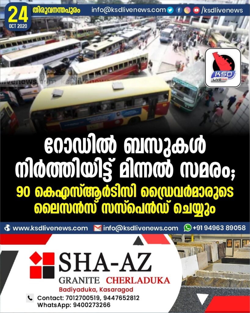 റോഡിൽ ബസുകൾ നിർത്തിയിട്ട് മിന്നൽ സമരം ; 90 കെഎസ്ആർടിസി ഡ്രൈവർമാരുടെ ലൈസൻസ് സസ്പെൻഡ് ചെയ്യും