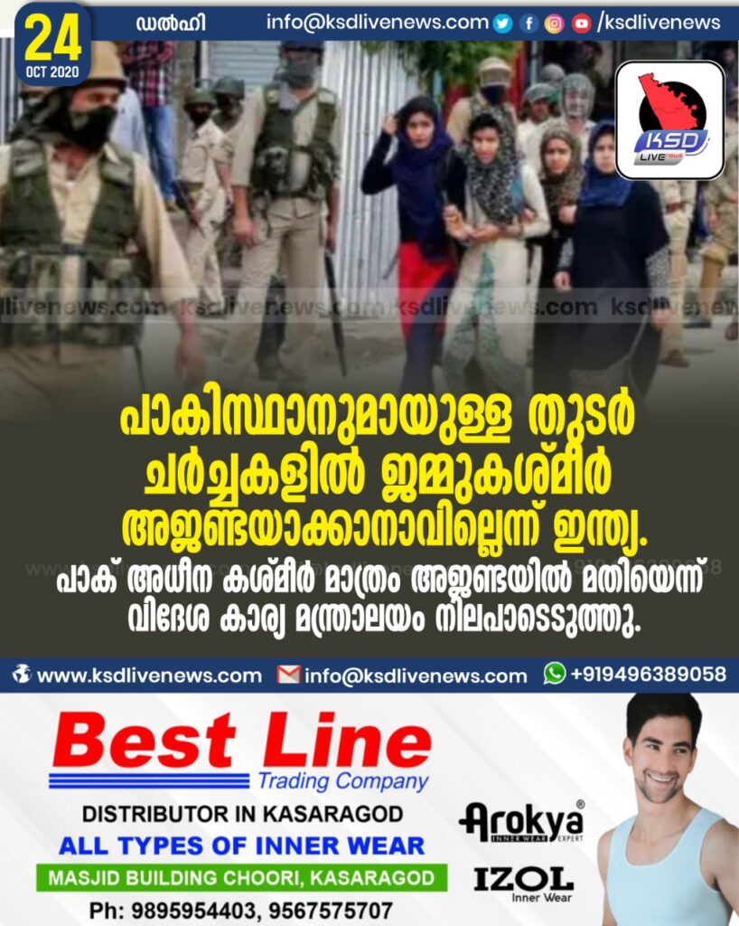 പാകിസ്ഥാനുമായുള്ള തുടര്‍ ചര്‍‍ച്ചകളില്‍ ജമ്മുകശ്മീര്‍ അജണ്ടയാക്കാനാവില്ലെന്ന് ഇന്ത്യ. പാക് അധീന കശ്മീര്‍ മാത്രം അജണ്ടയില്‍ മതിയെന്ന് വിദേശ കാര്യ മന്ത്രാലയം നിലപാടെടുത്തു.