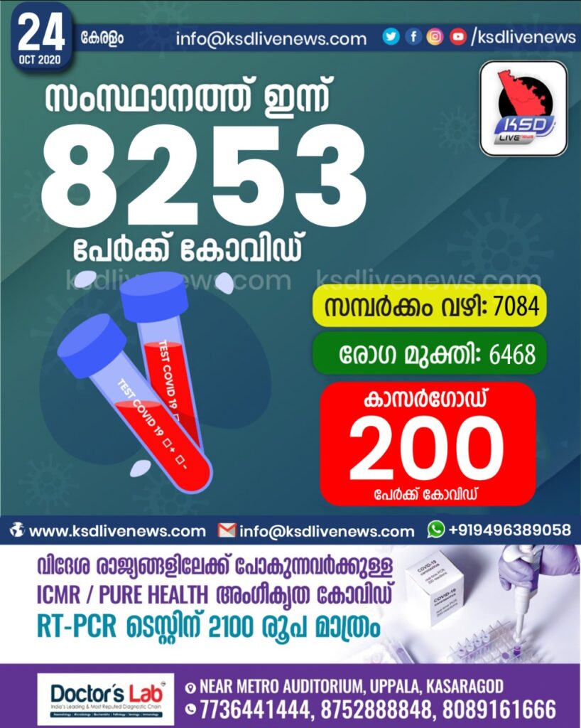 സംസ്ഥാനത്ത് ഇന്ന് 8253 പേർക്ക് കോവിഡ് സ്ഥിരീകരിച്ചു. സമ്പർക്കം വഴി 7084 പേർക്കും.രോഗ മുക്തി 6468 പേർക്കും. കാസർഗോഡ് ജില്ലയിൽ ഇന്ന് 200 പേർക്ക് കോവിഡ് സ്ഥിരീകരിച്ചു. മരണം 23