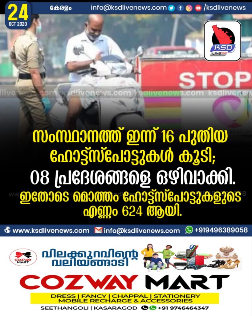 സംസ്ഥാനത്ത് ഇന്ന് 16 പുതിയ ഹോട്ട്സ്പോട്ടുകള് കൂടി; 08 പ്രദേശങ്ങളെ ഒഴിവാക്കി.ഇതോടെ മൊത്തം ഹോട്ട്സ്പോട്ടുകളുടെ എണ്ണം 624 ആയി.