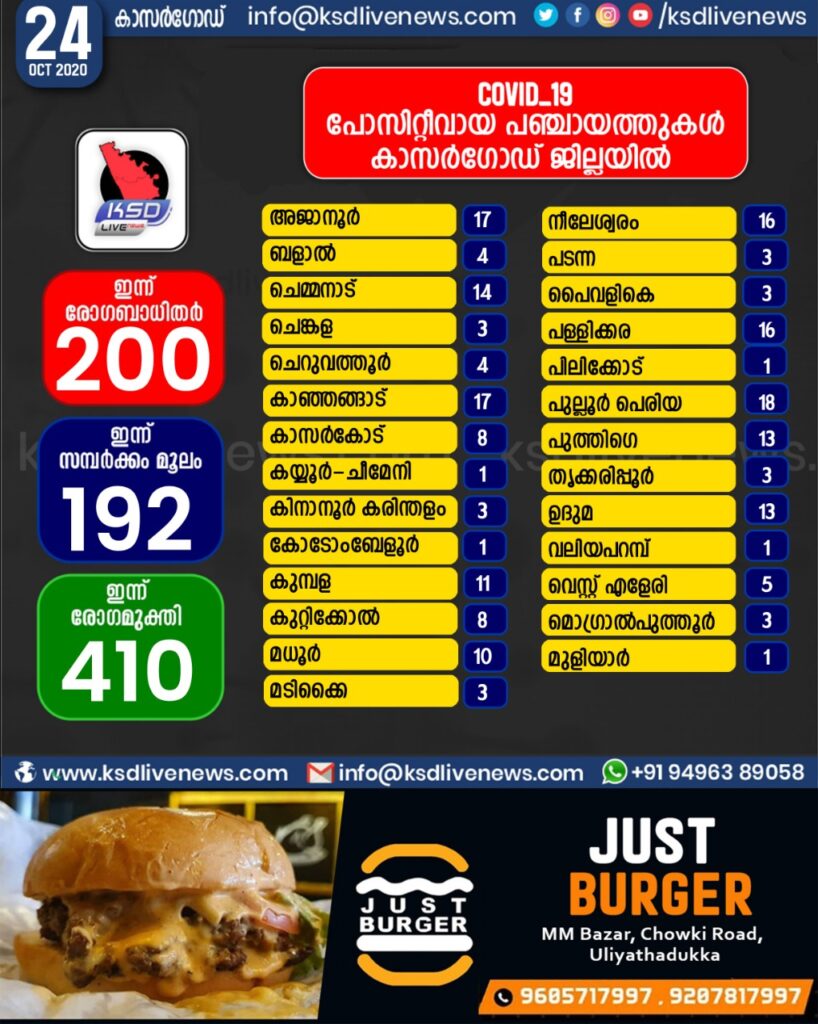 കാസർഗോഡ് ജില്ലയിൽ ഇന്ന് കോവിഡ് പോസിറ്റീവായവരുടെ പഞ്ചായത്ത് തിരിച്ചുള്ള സ്ഥിതി വിവര കണക്ക്