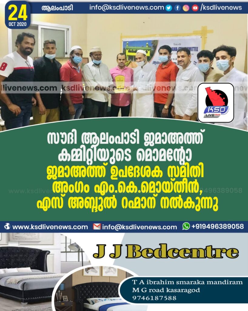 സൗദി ആലംപാടി ജമാഅത്ത് കമ്മിറ്റിയുടെ മൊമന്റോ ജമാഅത്ത് ഉപദേശക സമിതി അംഗം എം.കെ.മൊയ്തീൻ,എസ് അബ്ദുൽ റഹ്മാന് നൽകുന്നു