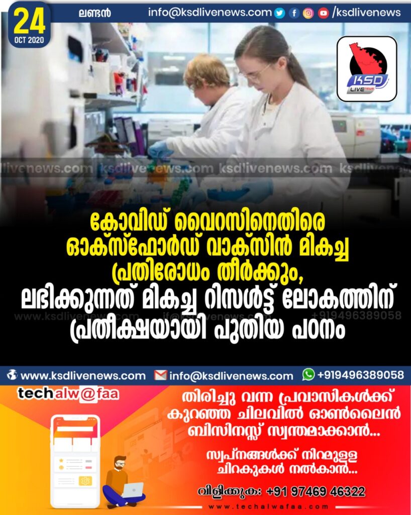 കോവിഡ് വൈറസിനെതിരെ ഓക്സ്ഫോർഡ് വാക്സിൻ മികച്ച പ്രതിരോധം തീർക്കും , ലഭിക്കുന്നത് മികച്ച റിസൾട്ട് ലോകത്തിന് പ്രതീക്ഷയായി പുതിയ പഠനം