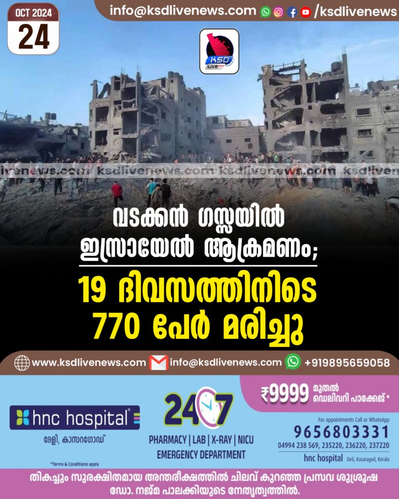 വടക്കൻ ഗസ്സയില് ഇസ്രായേല് ആക്രമണം; 19 ദിവസത്തിനിടെ 770 പേര് മരിച്ചു