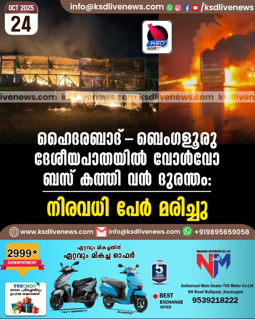 ഹൈദരബാദ്-ബെംഗളൂരു ദേശീയപാതയില് വോള്വോ ബസ് കത്തി വന് ദുരന്തം; നിരവധി പേര് മരിച്ചു