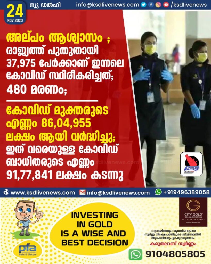 ഇന്നലെ 37,975 പേര്‍ക്ക് കൂടി കോവിഡ് ബാധ സ്ഥിരീകരിച്ചതോടെ, രാജ്യത്ത് വൈറസ് ബാധിച്ചവരുടെ എണ്ണം 91,77,841 ആയി ഉയര്‍ന്നു.
