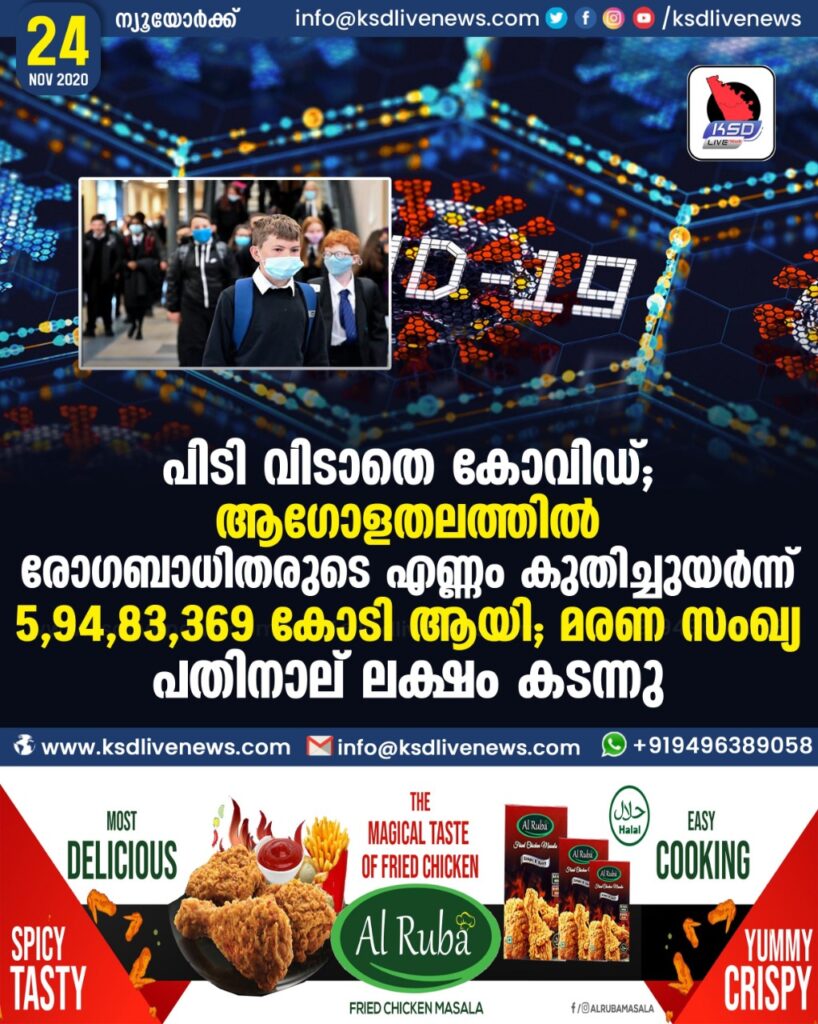 പിടി വിടാതെ കോവിഡ് ; ആഗോളതലത്തിൽ രോഗബാധിതരുടെ എണ്ണം കുതിച്ചുയർന്ന് 5,94,83,369 കോടി ആയി ; മരണ സംഖ്യ പതിനാല് ലക്ഷം കടന്നു