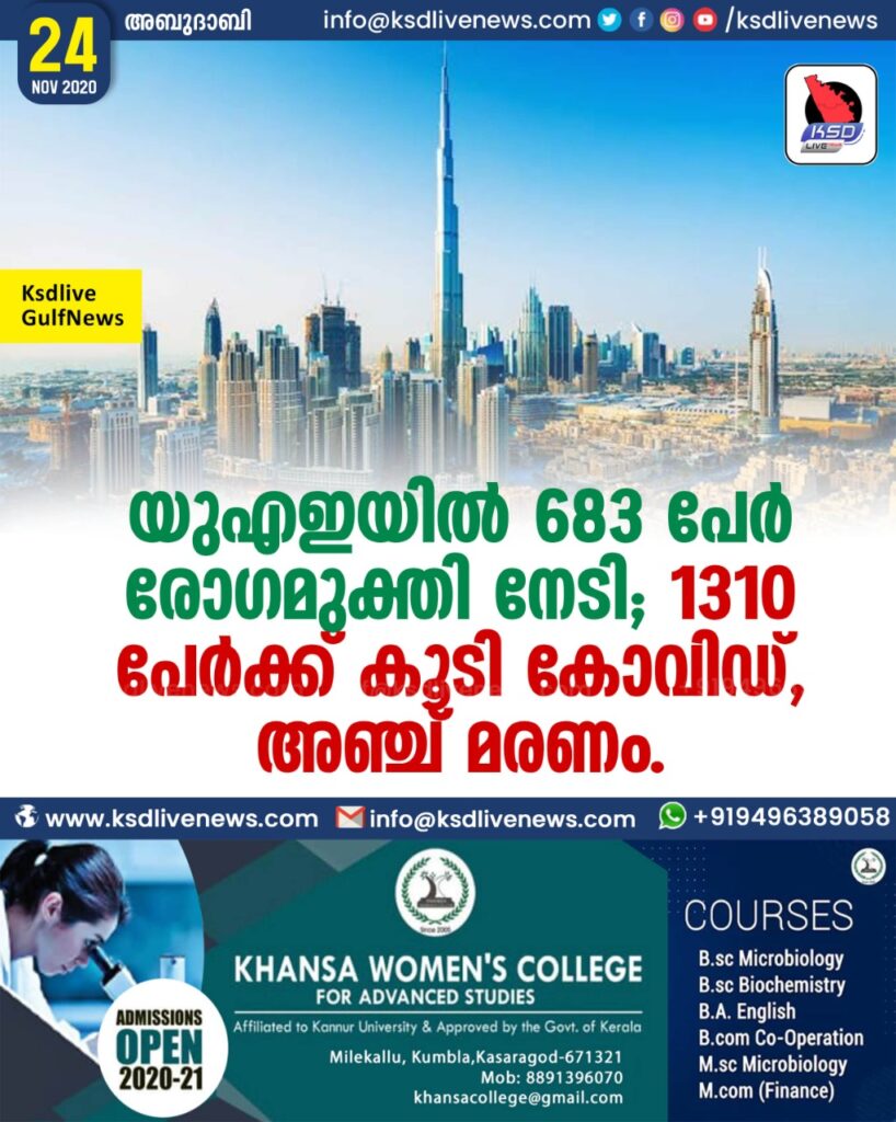 യുഎഇയിൽ 683 പേർ രോഗമുക്തി നേടി; 1310 പേർക്ക് കൂടി കോവിഡ്, അഞ്ച് മരണം.