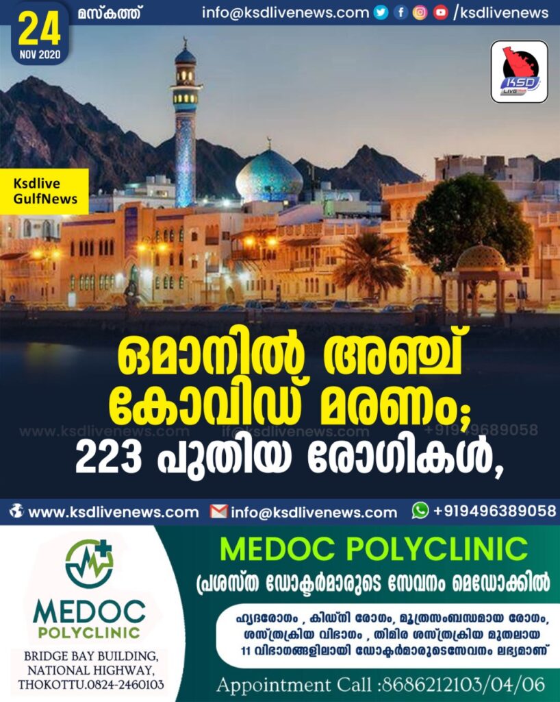ഒമാനില് അഞ്ച് കോവിഡ് മരണം; 223 പുതിയ രോഗികൾ,