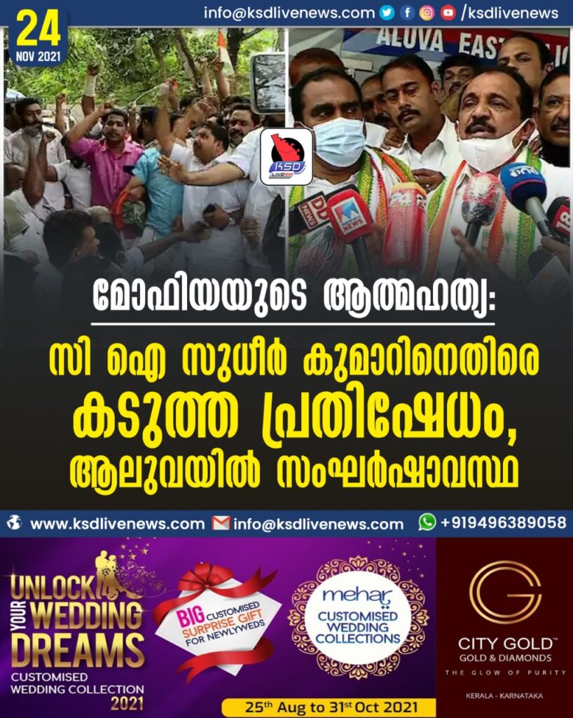 മോഫിയയുടെ ആത്മഹത്യ: സി ഐ സുധീർ കുമാറിനെതിരെ കടുത്ത പ്രതിഷേധം, ആലുവയില് സംഘര്ഷാവസ്ഥ