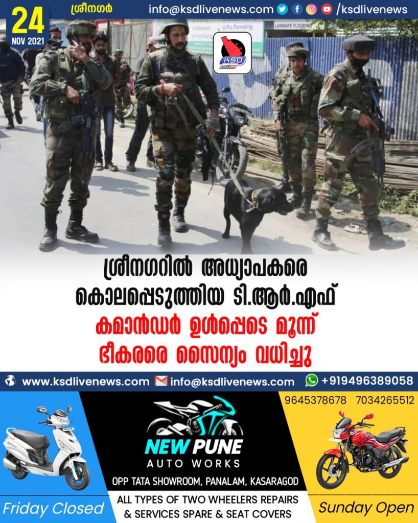 ശ്രീനഗറില്‍ അധ്യാപകരെ കൊലപ്പെടുത്തിയ ടി.ആര്‍.എഫ്. കമാന്‍ഡര്‍ ഉള്‍പ്പെടെ മൂന്ന് ഭീകരരെ സൈന്യം വധിച്ചു