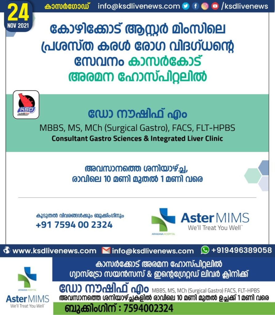 കോഴിക്കോട് ആസ്റ്റർ മിംസ് ഹോസ്പിറ്റലിലെ പ്രശസ്ത ഗാസ്ട്രോ എൻട്രോളജി & സർജറി വിഭാഗം ഡോക്ടർ നൗഷിഫിന്റെ സേവനം കാസറഗോഡ് അരമന ആശുപത്രിയില്