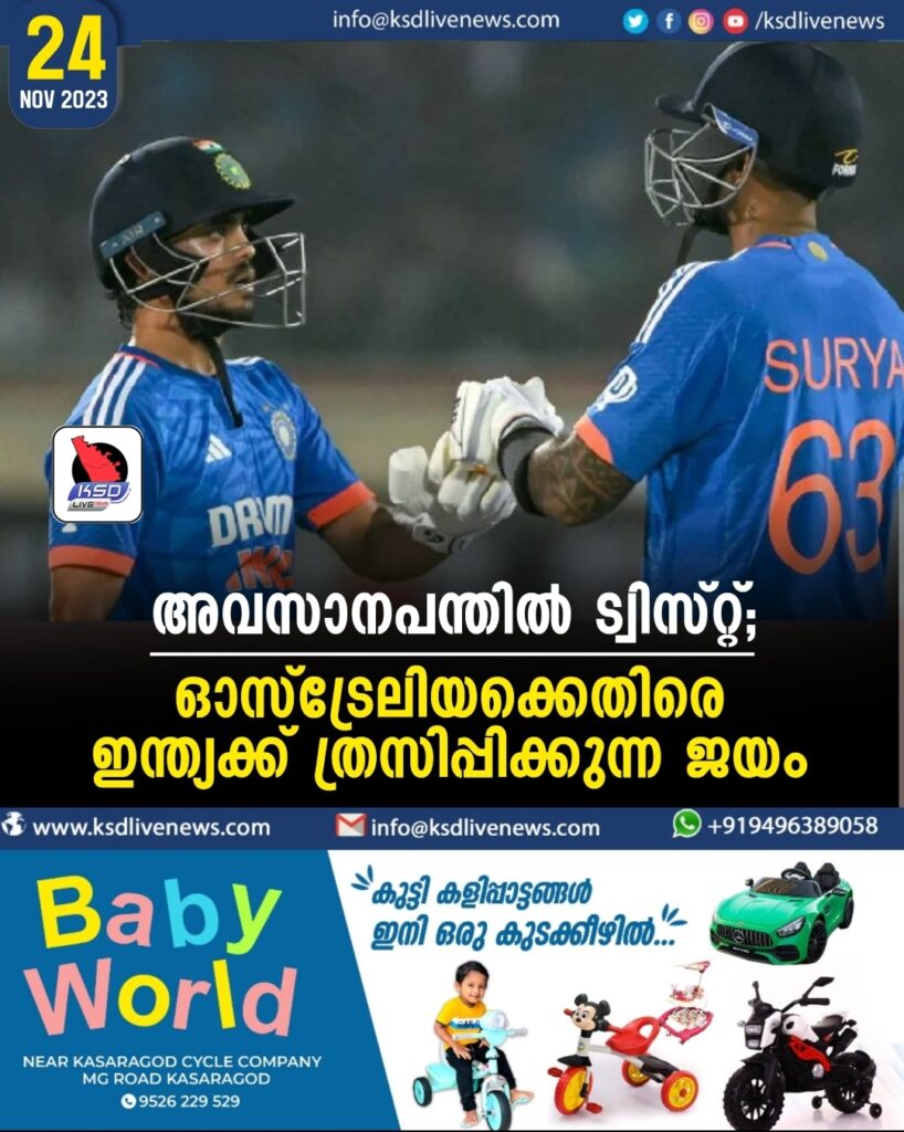 വിശാഖപട്ടണം: ട്വന്റി 20 ഇന്ത്യ – ഓസ്‌ട്രേലിയ പരമ്പരയിലെ ആദ്യ മത്സരത്തില്‍ ഇന്ത്യയ്ക്ക് തകര്‍പ്പന്‍ ജയം. ഓസ്‌ട്രേലിയ ഉയര്‍ത്തിയ 209 റണ്‍സ് വിജയലക്ഷ്യം ഒരു പന്ത് ശേഷിക്കെ ഇന്ത്യന്‍ യുവനിര മറികടന്നു. അവസാനപന്തിലേക്കുനീണ്ട ആവേശപ്പോരില്‍ രണ്ടുവിക്കറ്റിനാണ് ഇന്ത്യയുടെ വിജയം. അവസാന പന്തില്‍ വിജയിക്കാന്‍ ഒരു റണ്‍സ് വേണമെന്നിരിക്കെ റിങ്കുസിങ് പന്ത് സിക്‌സര്‍ പറത്തി. എന്നാല്‍ പന്ത് ഓവര്‍സ്‌റ്റെപ്പ് ചെയ്തതിന് അമ്പയര്‍ നോബോള്‍ വിളിച്ചതോടെ റിങ്കുവിന്റെ സിക്‌സര്‍ കൂടാതെതന്നെ ഇന്ത്യ വിജയം സ്വന്തമാക്കി. സ്‌കോര്‍: ഓസ്‌ട്രേലിയ 20 ഓവറില്‍ മൂന്നുവിക്കറ്റ് നഷ്ടത്തില്‍ 208. ഇന്ത്യ 19.5 ഓവറില്‍ എട്ട് വിക്കറ്റ് നഷ്ടത്തില്‍ 209. ഇന്ത്യന്‍ നായകന്‍ സൂര്യകുമാര്‍ യാദവും ഇഷാന്‍ കിഷനും അര്‍ധസെഞ്ചുറി നേടി. മറുപടി ബാറ്റിങിനിറങ്ങിയ ഇന്ത്യയ്ക്ക് 22 റണ്‍സെടുക്കുന്നതിനിടെ ഓപ്പണ്‍മാരായ ഋതുരാജ് ഗെയ്ക് വാദിന്റെയും യശ്വസി ജയ്‌സ്വാളിന്റെയും വിക്കറ്റ് നഷ്ടമായി. ആദ്യ ഓവറില്‍ ഗെയ്ക് വാദ് റണ്ണൗട്ടാവുകയായിരുന്നു. എട്ട് പന്തില്‍ രണ്ടുവീതം സിക്‌സും ഫോറും സഹിതം 21 റണ്‍സാണ് ജയ്‌സ്വാള്‍ നേടിയത്. മൂന്നാം ഓവറില്‍ മാറ്റ് ഷോര്‍ട്ടെറിഞ്ഞ പന്ത് സ്റ്റീവ് സ്മിത്തിന്റെ കൈകളിലെത്തിയതോടെ ജയ്‌സ്വാള്‍ മടങ്ങി. സൂര്യകുമാര്‍- ഇഷാന്‍ കിഷന്‍ മൂന്നാം വിക്കറ്റ് സംഖ്യമാണ് ഇന്ത്യയുടെ പോരാട്ടവീര്യം ഉയര്‍ത്തിയത്. 112 റണ്‍സിന്റെ കൂട്ടുകെട്ടാണ് ഇരുവരും പടുത്തുയര്‍ത്തിയത്. അഞ്ച് സിക്‌സും രണ്ട് ഫോറും സഹിതം 58 റണ്‍സാണ് ഇഷാന്‍ നേടിയത്. ഇഷാന്‍ പുറത്തായിട്ടും ഒരറ്റത്ത് സൂര്യകുമാര്‍ നിലയുറപ്പിച്ചു. നാല് സിക്‌സും ഒമ്പത് ഫോറും സഹിതം 80 റണ്‍സെടുത്തശേഷമാണ് സൂര്യകുമാര്‍ പുറത്തായത്. ഈ സമയം ഇന്ത്യന്‍ സ്‌കോര്‍ 194. എന്നാല്‍, അവസാന ഓവറില്‍ മൂന്നുവിക്കറ്റ് നഷ്ടമായതോടെ ആശങ്കയുടെ നിമിഷങ്ങള്‍. അസ്‌കര്‍ പട്ടേല്‍(2), രവി ബിഷ്‌ണോയി(0), അര്‍ഷ് ദ്വീപ് (0) എന്നിവരുടെ വിക്കറ്റാണ് നഷ്ടമായത്. അവസാന പന്തില്‍ ജയിക്കാന്‍ വേണ്ടത് ഒരു റണ്‍സ്. സീന്‍ അബോട്ടെറിഞ്ഞ അവസാനപന്തില്‍ റിങ്കുസിങിന്റെ പടുകൂറ്റന്‍ സിക്‌സര്‍. എന്നാല്‍ ഈ പന്ത് നോബോള്‍ വിളിച്ചതോടെ സിക്‌സര്‍ കൂടാതെതന്നെ ഇന്ത്യ വിജയം കരസ്ഥമാക്കി. 14 പന്തില്‍ 22 റണ്‍സാണ് റിങ്കു നേടിയത്. നേരത്തെ, സെഞ്ചുറിയുമായി കളത്തില്‍ നിറഞ്ഞാടിയ ജോഷ് ഇന്‍ഗ്ലിസിന്റെ കരുത്തിലാണ് കൂറ്റന്‍ സ്‌കോര്‍ ഓസ്‌ട്രേലിയ കെട്ടിപ്പടുത്തത്. ടോസ് നേടിയ ഇന്ത്യ ബോളിങ് തിരഞ്ഞെടുക്കുകയായിരുന്നു. ഓസ്‌ട്രേലിയയ്ക്കുവേണ്ടി ഓപ്പണറായെത്തിയ സ്റ്റീവ് സ്മിത്ത് അര്‍ധ സെഞ്ചുറി നേടി. 52 റണ്‍സെടുത്ത സ്മിത്ത് റണ്‍ ഔട്ട് ആയി. മാത്യു ഷോര്‍ട്ട് 13, ജോഷ് ഇന്‍ഗ്ലിസ് 110, മാര്‍ക്കസ് സ്റ്റോണിസ് 