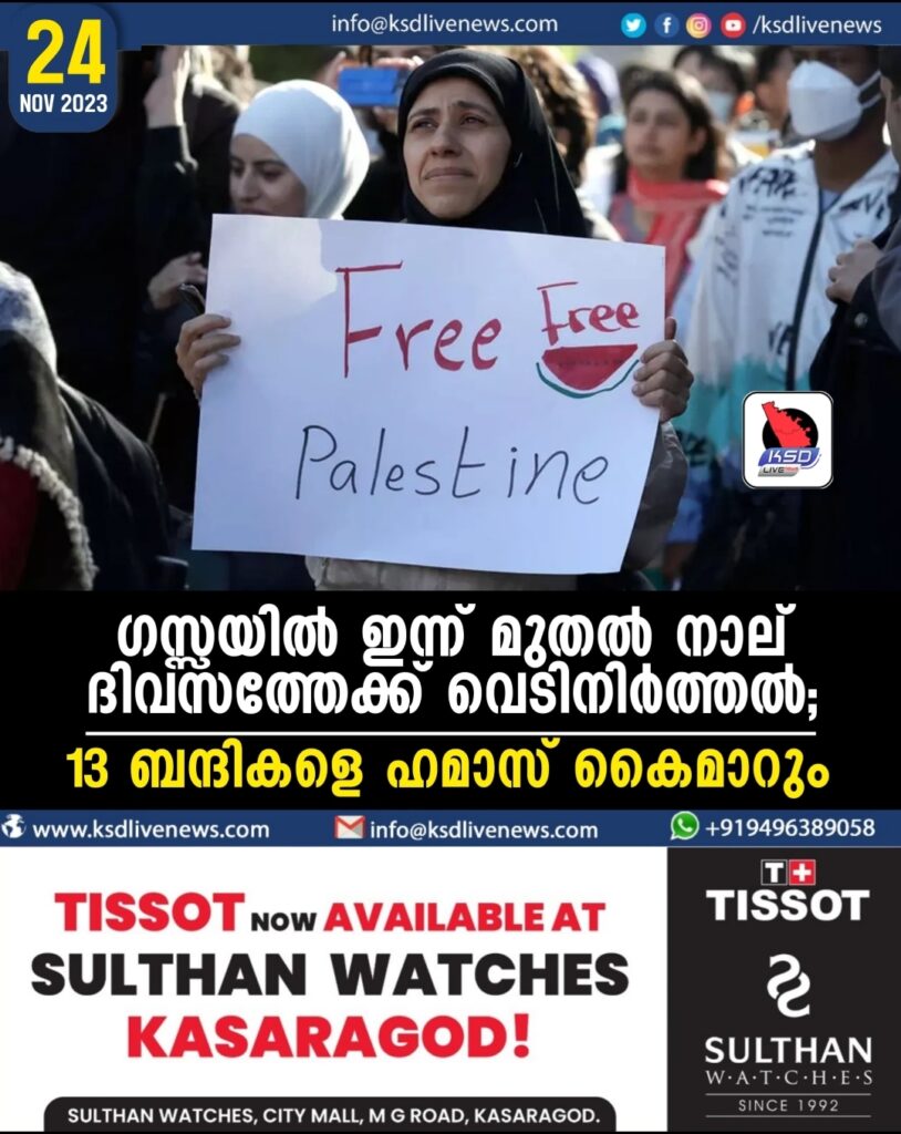 ഗസ്സയിൽ ഇന്ന് മുതൽ നാല് ദിവസത്തേക്ക് വെടിനിർത്തൽ; 13 ബന്ദികളെ ഹമാസ് കൈമാറും