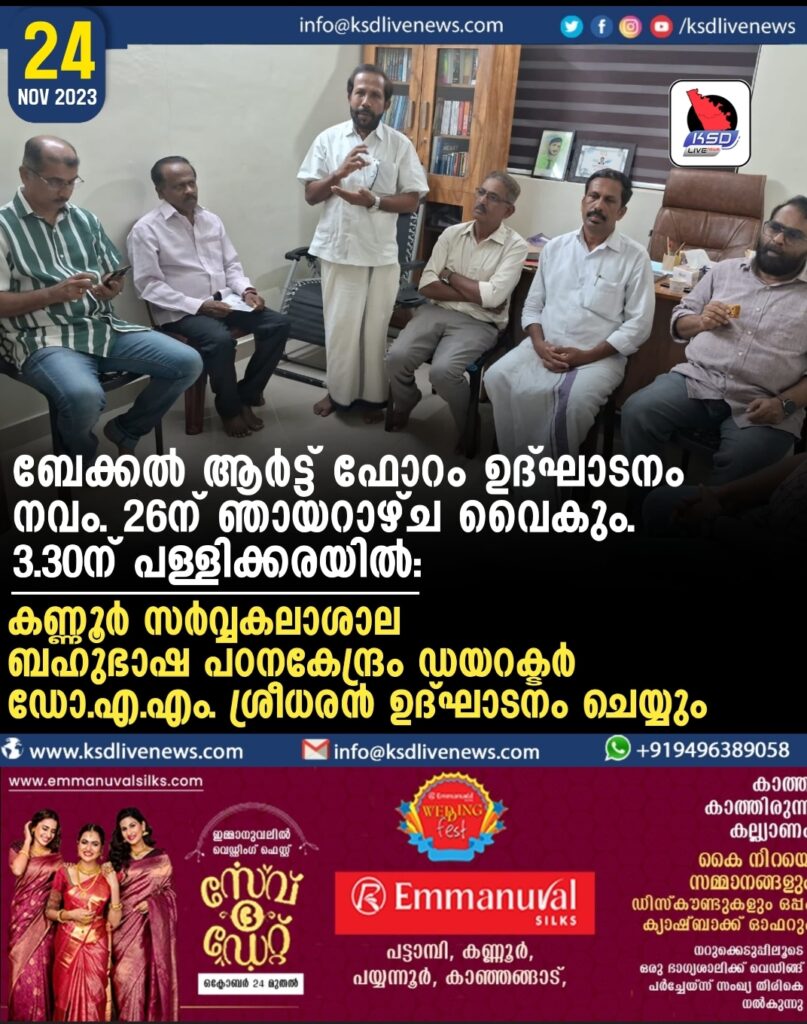 ബേക്കൽ ആർട്ട് ഫോറം ഉദ്ഘാടനം നവം.26 ന് ഞായറാഴ്ച വൈകും.3.30 ന് പള്ളിക്കരയിൽ -കണ്ണൂർ സർവ്വകലാശാല ബഹുഭാഷ പഠനകേന്ദ്രം ഡയറക്ടർ ഡോ.എ.എം.ശ്രീധരൻ ഉദ്ഘാടനം ചെയ്യും