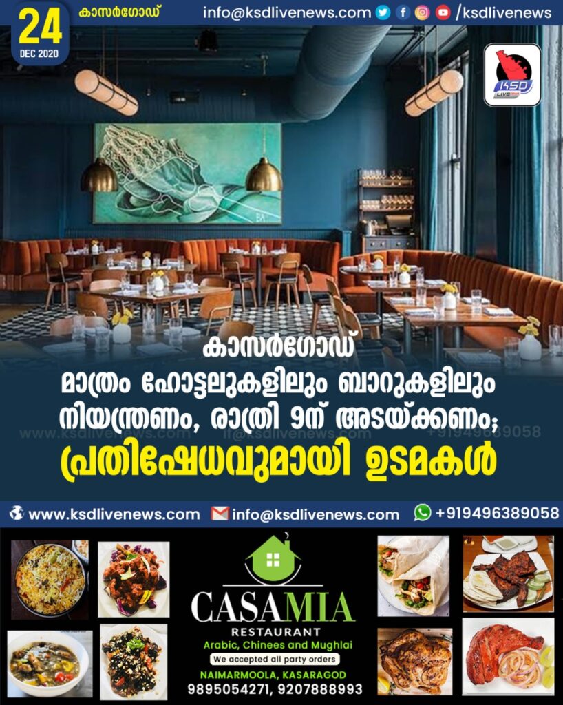 കാസർഗോഡ് മാത്രം ഹോട്ടലുകളിലും ബാറുകളിലും നിയന്ത്രണം, രാത്രി 9ന് അടയ്ക്കണം ; പ്രതിഷേധവുമായി ഉടമകൾ.