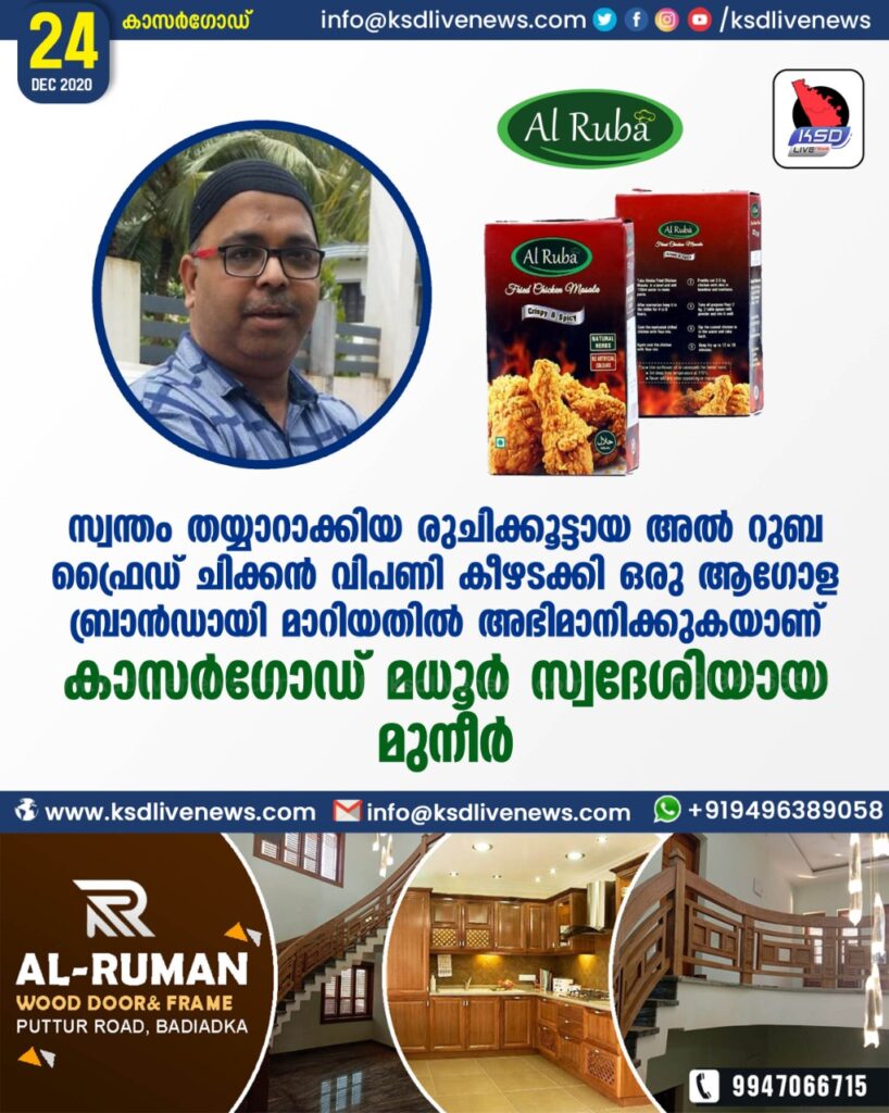 സ്വന്തം തയ്യാറാക്കി യ രുചിക്കൂട്ടായ അൽ റുബ ഫ്രൈഡ് ചിക്കൻ വിപണി കീഴടക്കി ഒരു ആഗോള ബ്രാൻഡായി മാറിയതിൽ അഭിമാനിക്കുകയാണ് കാസർഗോഡ് മധൂർ സ്വദേശിയായ മുനീർ