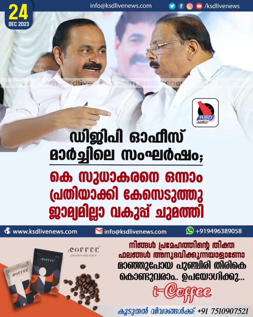 ഡിജിപി ഓഫീസ് മാർച്ചിലെ സംഘർഷം; കെ സുധാകരനെ ഒന്നാംപ്രതിയാക്കി കേസെടുത്തു, ജാമ്യമില്ലാ വകുപ്പ് ചുമത്തി