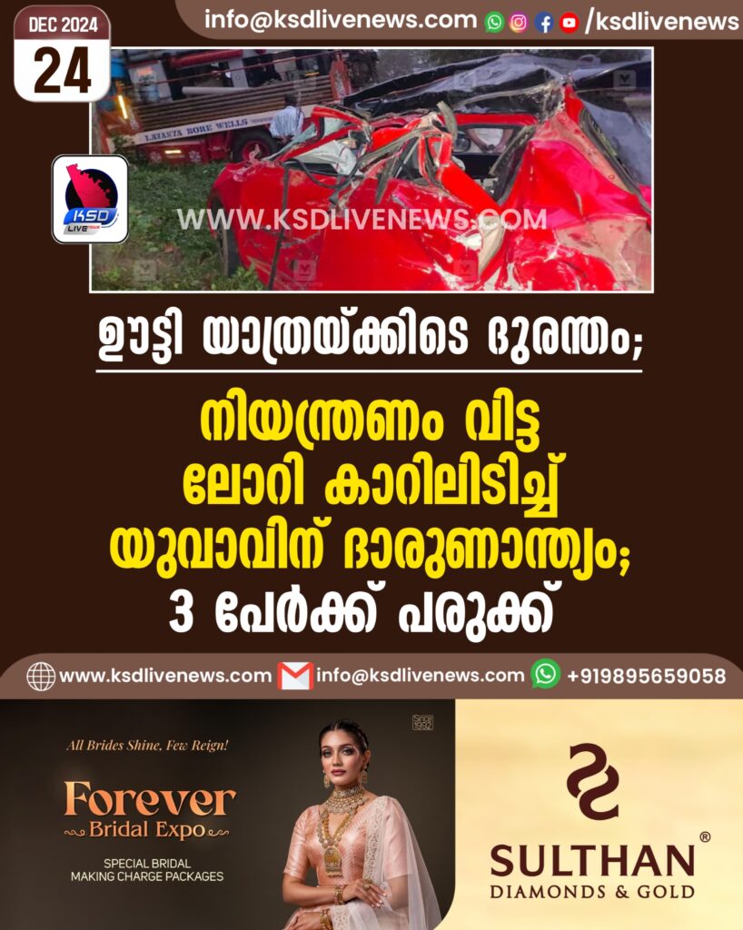 ഊട്ടി യാത്രയ്ക്കിടെ ദുരന്തം; നിയന്ത്രണം വിട്ട ലോറി കാറിലിടിച്ച് യുവാവിന് ദാരുണാന്ത്യം, 3 പേർക്ക് പരുക്ക്
