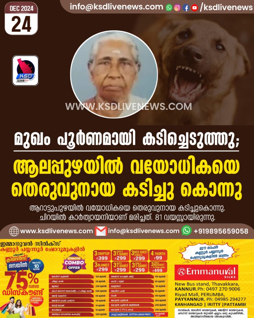 മുഖം പൂര്ണമായി കടിച്ചെടുത്തു; ആലപ്പുഴയില് വയോധികയെ തെരുവുനായ കടിച്ചു കൊന്നു