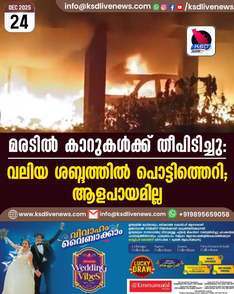 മരടിൽ കാറുകൾക്ക് തീപിടിച്ചു: വലിയ ശബ്ദത്തിൽ പൊട്ടിത്തെറി; ആളപായമില്ല