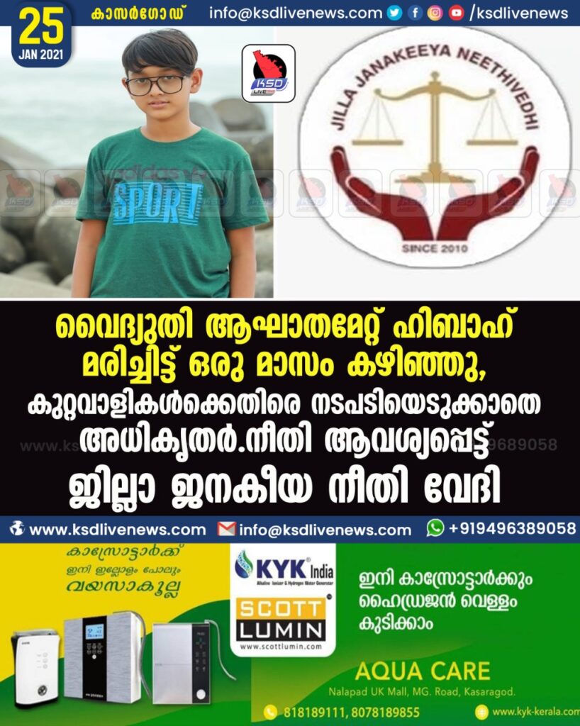 വൈദ്യുതി ആഘാതമേറ്റ് ഹിബാഹ് മരിച്ചിട്ട് ഒരു മാസം കഴിഞ്ഞു , കുറ്റവാളികൾക്കെതിരെ നടപടിയെടുക്കാതെ അധികൃതർ.നീതി ആവശ്യപ്പെട്ട് ജില്ലാ ജനകീയ നീതി വേദി
