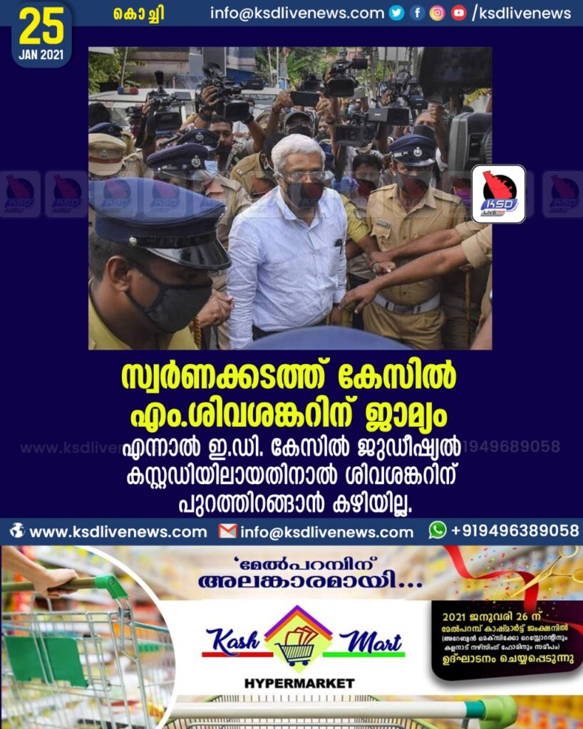 സ്വർണകള്ളക്കടത്ത് കേസിലെ 23-ാം പ്രതിയാണ് ശിവശങ്കർ. ഈ കേസിലാണ് നിലവിൽ ശിവശങ്കറിന് ജാമ്യം ലഭിച്ചിരിക്ക