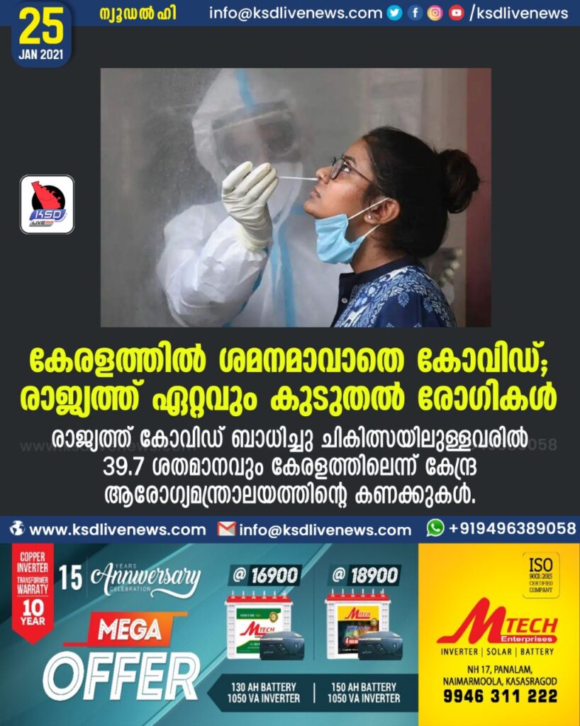 കേരളത്തിലും മഹാരാഷ്ട്രയിലുമായാണ് കോവിഡ് ബാധിതരില് 65 ശതമാനവും. രാജ്യത്തെ ആകെ ആക്ടിവ് കേസുകളുടെ 25 ശതമാനമാണ് മഹാരാഷ്ട്രയില് ഉള്ളത്-46,057 പേര്. രാജ്യത്ത് ആകെ കോവിഡ് ബാധിച്ചവരുടെ 1.73 ശതമാനം മാത്രമാണ് ആക്ടിവ് കേസുകളെന്ന് ആരോഗ്യമന്ത്രാലയം അറിയിച്ചു.