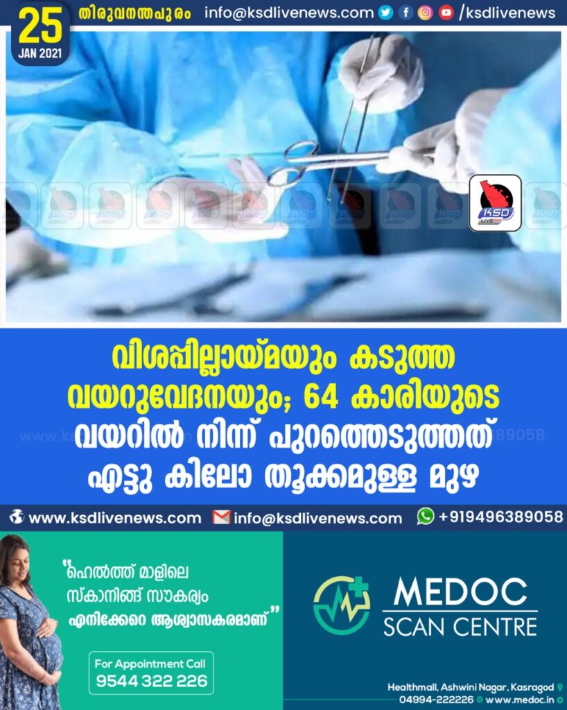 വിശപ്പില്ലായ്മയും കടുത്ത വയറുവേദനയും ; 64 കാരിയുടെ വയറിൽ നിന്ന് പുറത്തെടുത്തത് എട്ടു കിലോ തൂക്കമുള്ള മുഴ
