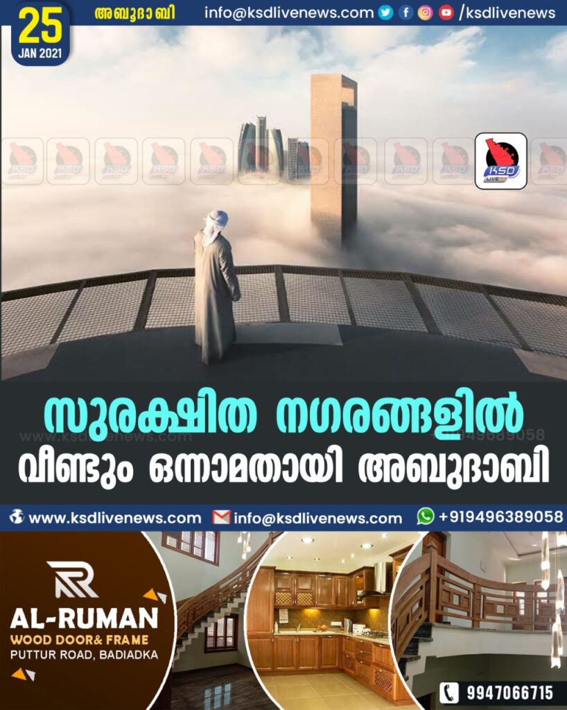 സുരക്ഷിത നഗരങ്ങളിൽ വീണ്ടും ഒന്നാമതായി അബുദാബി