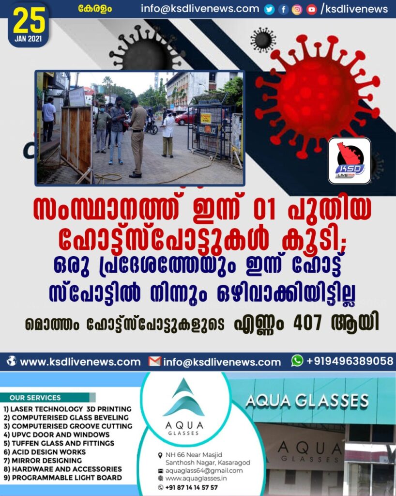 ഇന്ന് ഒരു പുതിയ ഹോട്ട് സ്പോട്ടാണുള്ളത്. കാസര്ഗോഡ് ജില്ലയിലെ വലിയ പറമ്പ് (കണ്ടൈന്മെന്റ് വാര്ഡ് 1) ആണ് പുതിയ ഹോട്ട് സ്പോട്ട്.